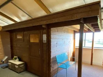 Houten aanbouw terrasoverkapping met dakshingles 250cm diep