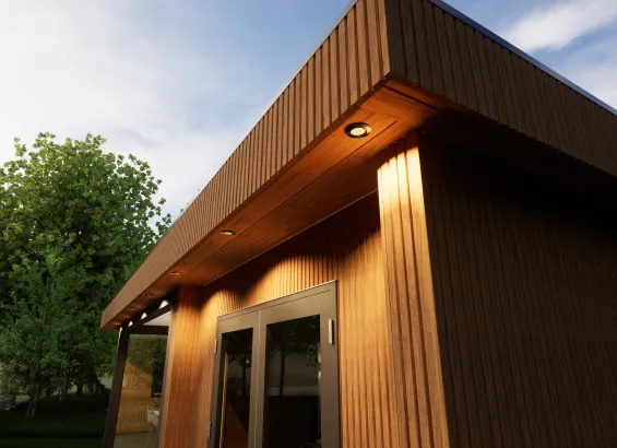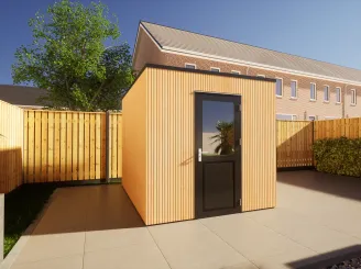 - Wanden bekleed met thermo ‘’Ayous’’ gevelbekleding in Rhombus profiel.