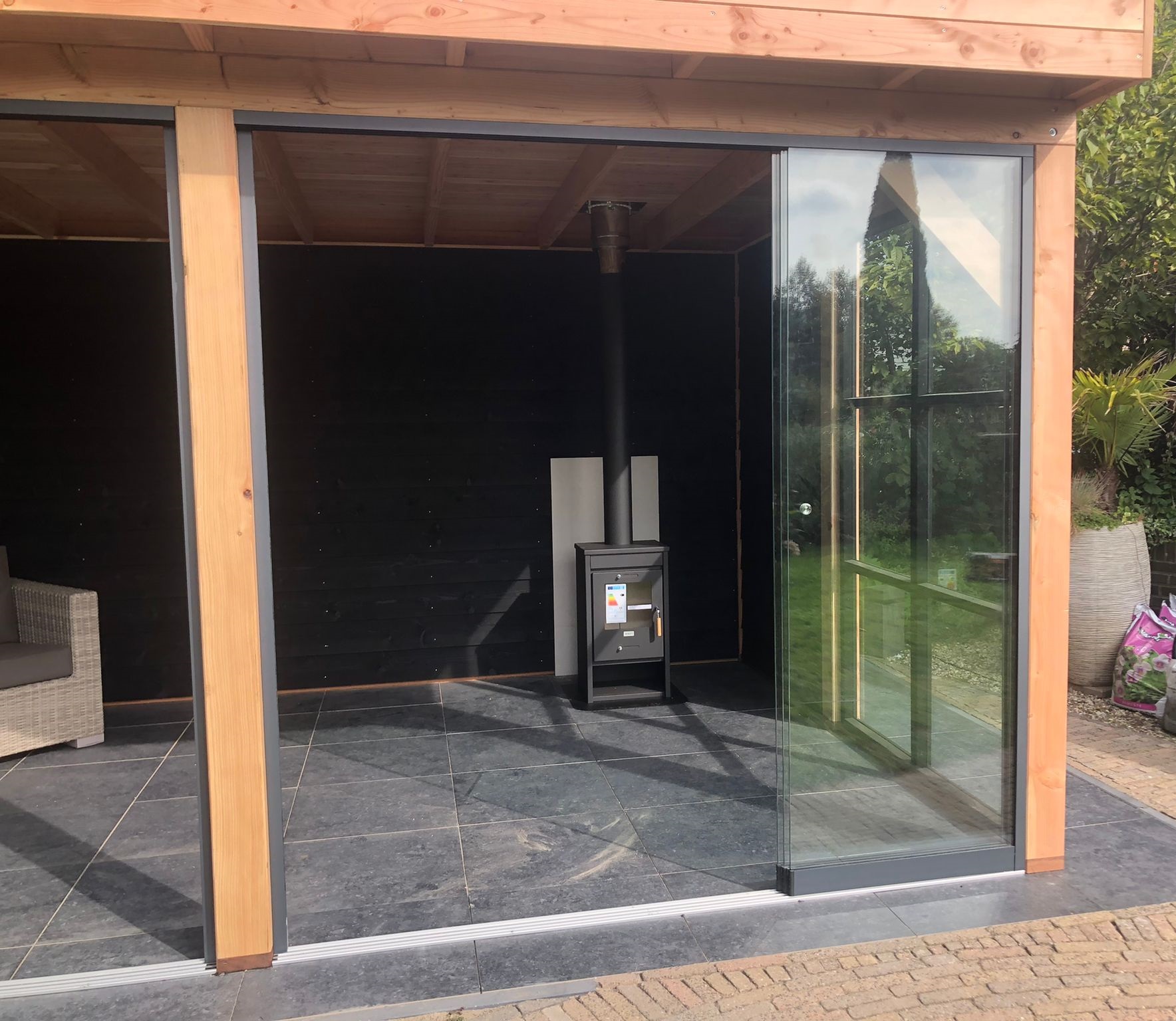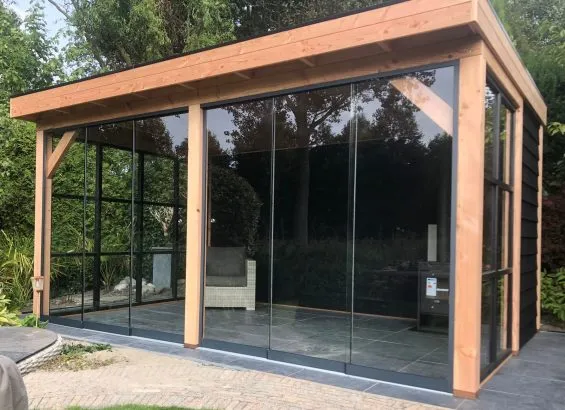 U bent met de glazen schuifwanden beschermd tegen de weersinvloeden, maar u behoudt maximaal contact met uw tuin. Zowel als voor- en zijwand verkrijgbaar!