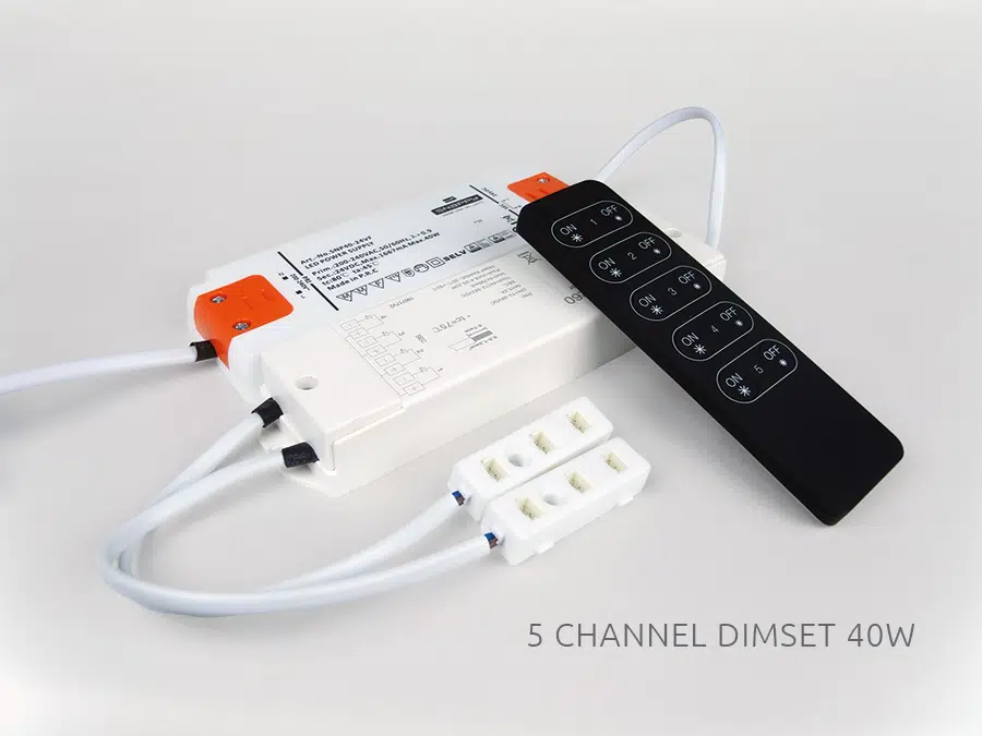 6x 3 watt LED spot + dimbare driver/trafo + 5 kanaals afstandsbediening + 6 verlengkabels (2x 3 meter, 2x 5 meter, 2x 7 meter)