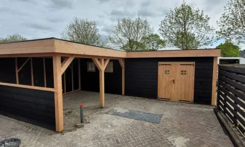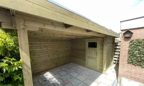 Douglas berging + overkapping (maatwerk) – Afmeting ca. 514x280cm buitenkant staanders – Berging ca. 200x280cm buitenkant staanders – Totale breedte ca. 520cm dakmaat – Uitgevoerd in elementbouw…