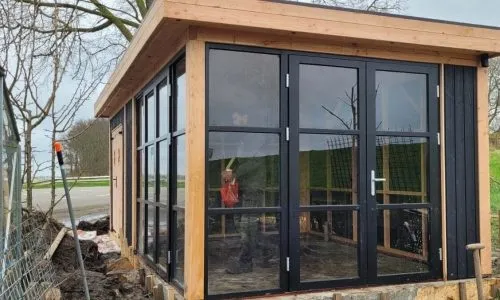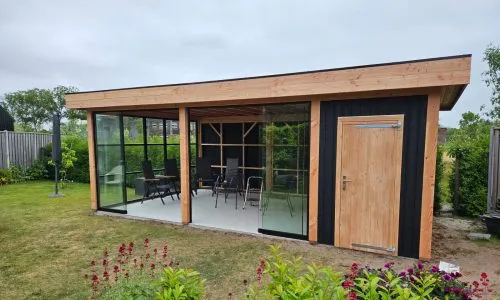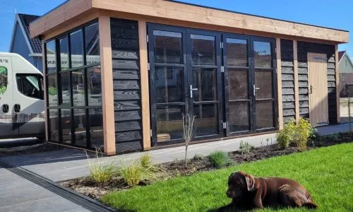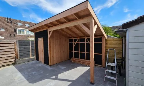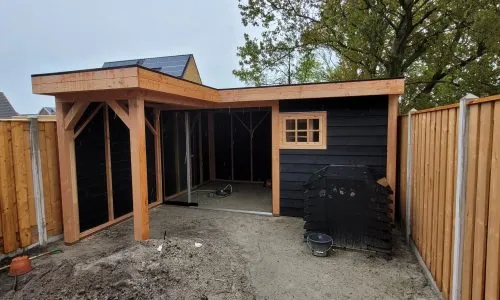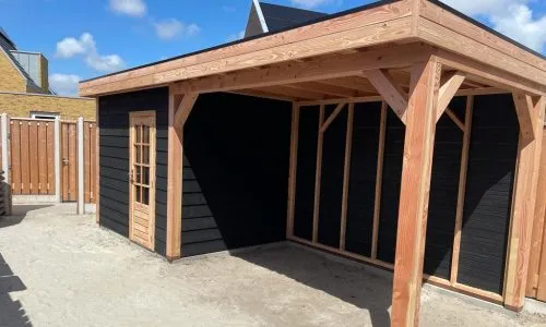 “Berging + Overkapping“ (uitgaande van model Larimar) -550x200cm (staandermaat), waarvan berging 250x200cm (staandermaat) -Elementbouw -RedClass dakhout 18x135mm en RedClass wandregels (Douglas-look) -Wanden aan de buitenzijde bekleed met…