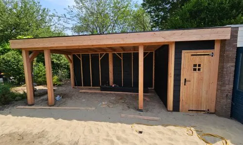 Douglas berging + overkapping L-model (maatwerk) – Afmeting ± 800×800/350cm buitenkant staanders – Berging ± 800x350cm, overkapping ± 350x450cm – Uitgevoerd in elementbouw – Wanden enkelzijdig bekleed…
