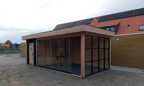 Daalders Choice plat dak model maatwerk -34mm vuren gecoat blokhuthout wanden in ral 7033, accenten in ral 7032 -±450x250cm orenmaat, waarvan berging ±170cm binnenmaat -Achterwand + klein…