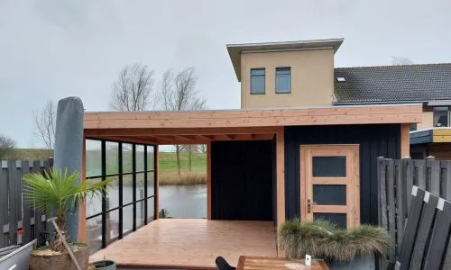 Douglas tuinkamer, overkapping en berging maatwerk –Totale dakmaat ±1240x360cm -Tuinkamer ca.509x331cm -Berging ca.350x331cm -Wanden aan de buitenzijde bekleed met zwart Zweeds rabat 24mm Incl. losse materialen t.b.v.…