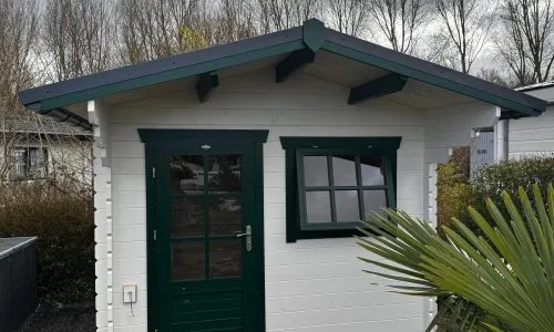 Blokhut “Koraal de Luxe” -34mm vuren blokhuthout -300x250cm orenmaat -Gecoat 2x aan de buitenzijde, wanden RAL9010, accenten RAL6005 -1 Vuren enkele deur half glas -1 Vuren uitzetraam…