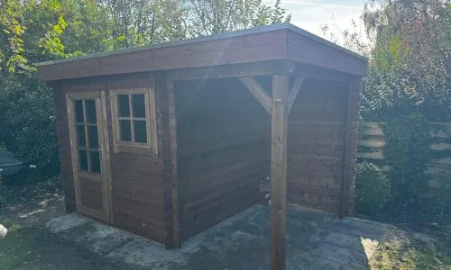 Blokhut Maatwerk -250x250cm orenmaat + zijluifel 150cm -34mm vuren bruin geïmpregneerd blokhuthout -Achterwand en klein stukje zijwand zijluifel gesloten -1 Steunpaal 90x90mm -Vuren enkele deur met hoog…