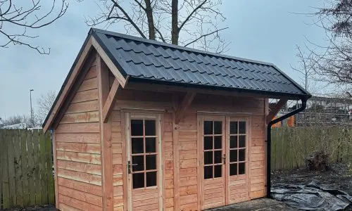 Douglas berging -400x400cm staandermaat -Elementbouw, wanden bekleed met Douglas zwart Zweeds rabat -4 Douglas staanders geschaafd 140x140mm -Douglas Prestige dubbele deur, half glas -Isolatie glas -Douglas enkele…