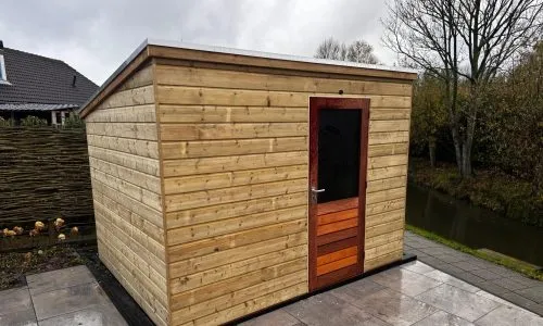 Berging maatwerk -300x200cm buitenkant wand -Wanden enkelzijdig bekleed met Douglas-look rhombus profiel -Hardhouten rand onder de wanden -Enkele zwarte deur, half glas -Dubbel glas -Plat dak -Hoogte…