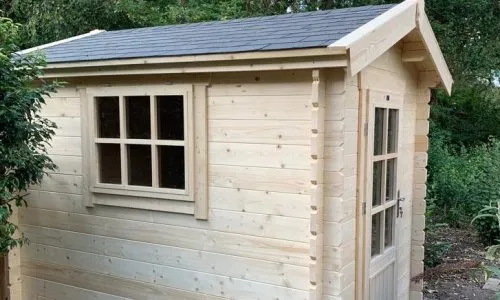 Blokhut Razende Bol – 250x200cm orenmaat -34mm Vuren blokhuthout -Gecoat 2x buitenzijde -1x Vuren enkele deur half glas -1x Vuren uitzetraam -Cilinderslot en stelbare scharnieren -Enkel glas…