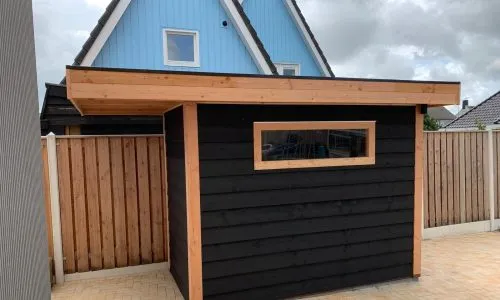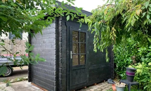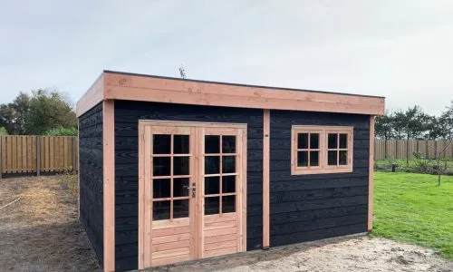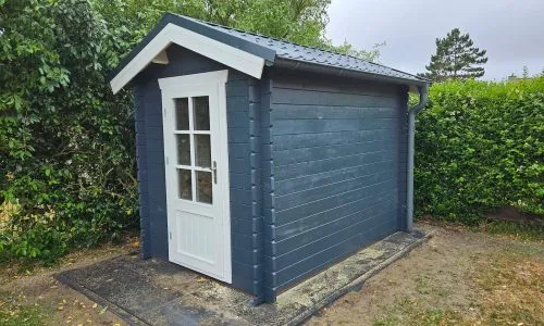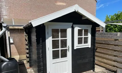 Blokhut “Botgat“ -300x200cm -34mm blokhuthout ( zwart gecoat 2x buitenzijde ) -1 vuren gelamineerde enkele deur half glas incl. enkel glas 4mm dik -Lessenaars dak incl.dakshingles -Hang…