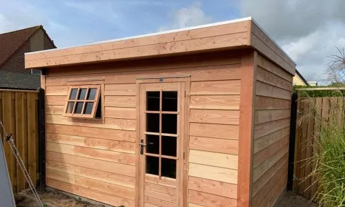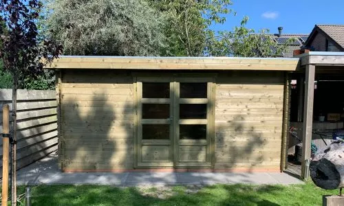 “ Blokhut Terschelling“ ( maatwerk ) -500x300cm ( orenmaat ) -34mm groen geïmpregneerd blokhuthout -In de voorzijde van de blokhut een vuren gelamineerde dubbele deur 3-vaks verdeling…