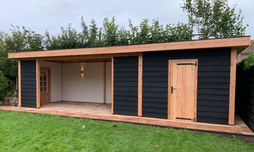 “ Douglas berging + overkapping “ -900x300cm ( buitenkant staander ) , waarvan berging 300x300cm -Elementbouw -Wanden aan de buitenzijde bekleed met zwart Zweeds rabat 24mm -Achterwand…