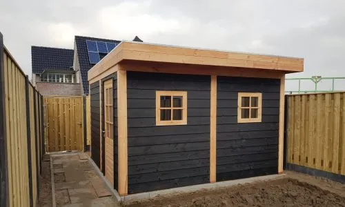 Afmeting 290x540cm Uitgevoerd in elementbouw, wanden bekleed met geïmpregneerd gevelrabat 18mm (aan 1 zijde bekleed), RVS genageld op solide frame Hardhouten funderingsrand onder de wanden Douglas enkele…