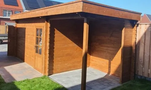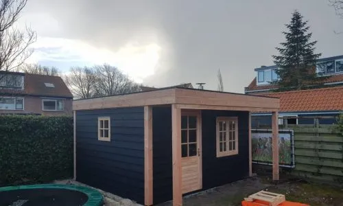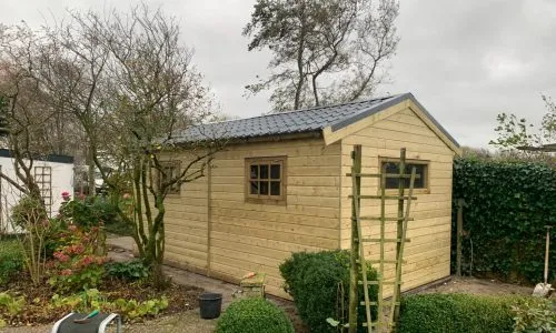 – Afmeting 450x300cm binnenmaat + luifel 90cm – Uitgevoerd in 45mm protex behandeld blokhuthout – Hardhouten enkele deur half glas – 2x hardhouten vast raam – Enkel…