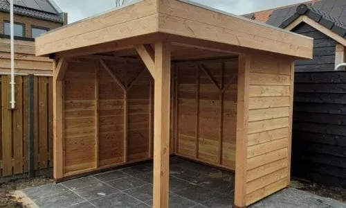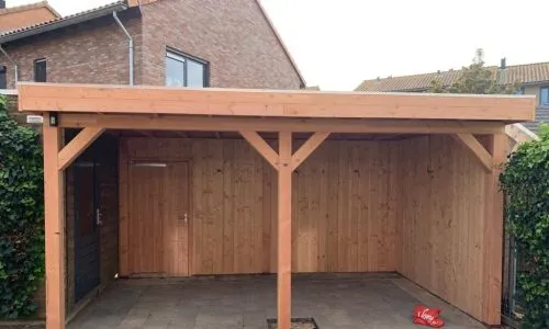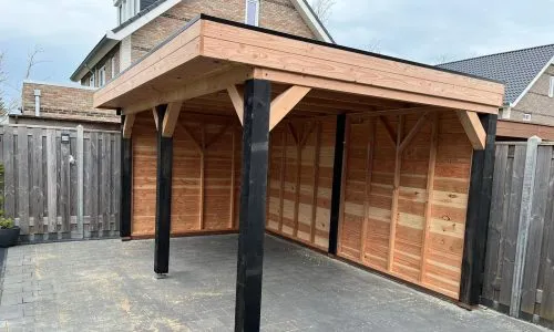 Douglas Aanbouw Overkapping -±520 Dakmaat x 300cm staandermaat -Voorluifel ±40cm -Elementbouw, wanden enkelzijdig bekleed Douglas blank Zweeds rabat 27mm, RVS genageld -Achterwand en rechterzijwand gesloten -Hardhouten rand…