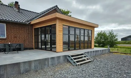 Douglas Veranda -Ca. 300x250cm (buitenkant staanders) -Elementbouw -RedClass dakhout 18x135mm en RedClass wandregels (Douglas-look) -Wanden aan de buitenzijde enkelzijdig bekleed met zwart Zweeds rabat 24mm -Achterwand en…
