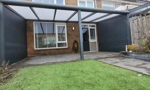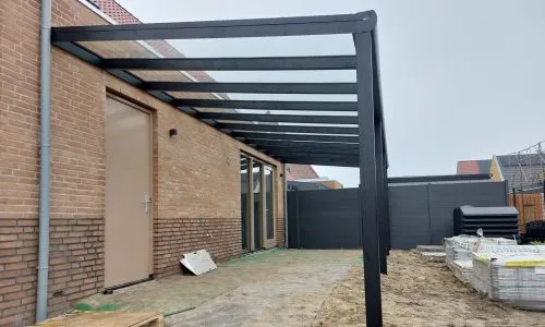 Profiline terrasoverkapping – Afmeting ca. 580x300cm – Antraciet structuurlak – 3 staanders – 3 Betonpoeren (uitloop bovengronds) – Bovenkant muurprofiel 275cm – Incl. 16mm polycarbonaatplaat X-structuur Opaal…
