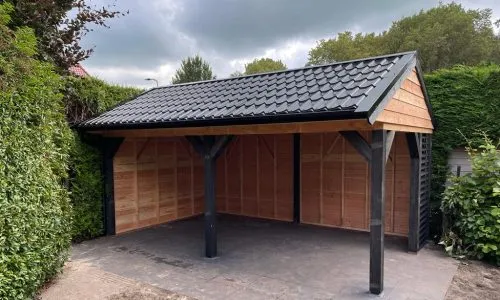 Douglas vrijstaande overkapping“ – Afmeting ±500x300cm buitenmaat staanders – Dakoverstek aan de voorzijde ±40cm, andere zijdes gelijk – Uitgevoerd in elementbouw; -Achterwand en linkerzijwand aan de buitenzijde…