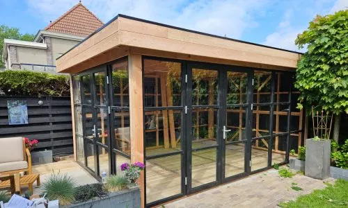 ’Douglas tuinkamer’’ (maatwerk) -Ca. 509x359cm (buitenkant staanders) -Plat dak + EPDM dakbedekking incl. spraylijm, onderuitloop & kit + zwarte hoek-trim -Dakoverstek voorzijde + zijkanten ca. 25cm, achterzijde…