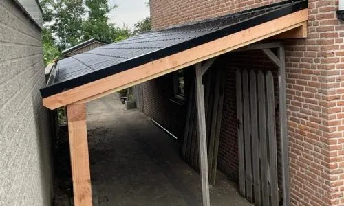 Douglas aanbouw overkapping/carport -ca.870x247cm ( buitenkant staander ) -5 staanders 150x150mm + 10 schoren aan de voorzijde -5 betonpoeren incl. stelplaatje -Lessenaarsdak incl. dakpan profielplaten incl. folie,…