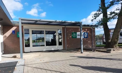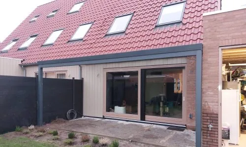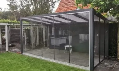 Profiline Verasol terrasoverkapping -ca.580x252cm ( buitenkant staander ) -Antraciet -Gelaagd glas -Op 2 staanders + xs goot en verstevigingskoker -Vlakke goot -Betonpoerfundatie -Aanbouwhoogte ca.285cm onderkant bestaande goot…