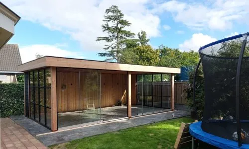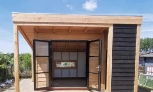 Douglas prieel De afmeting hiervan is 305x305cm. Op het platte dak is een EPDM dakbedekking aangebracht. De wanden zijn aan de buitenzijde bekleed met Douglas blank Zweeds…