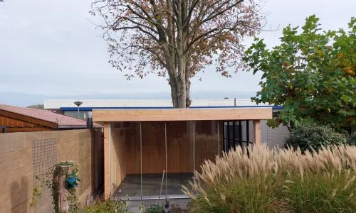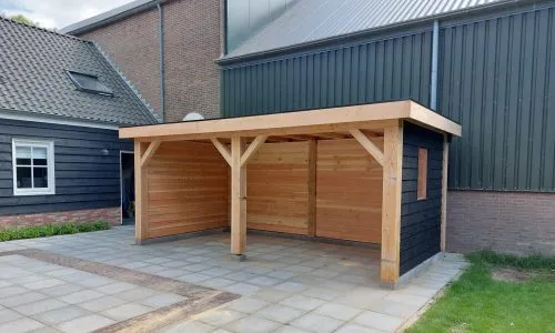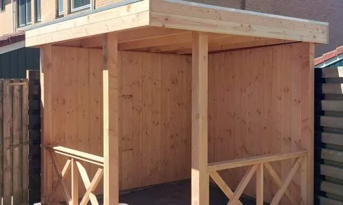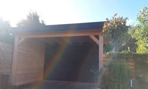 Vrijstaande overkapping “Robijn Maatwerk” -±728x405cm staandermaat -Achterwand enkelzijdig bekleed met zwart vuren Zweeds rabat 24mm, zwart genageld -Beide zijdes enkelzijdig ±95cm gesloten met zwart vuren Zweeds rabat…