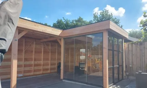 Douglas overkapping L-model -Ca. 480x480cm (buitenkant staanders) -Plat dak + EPDM dakbedekking incl. spraylijm, zij-uitloop en kit + zwarte hoek-trim -Dakoverstek ca. 20cm, achter & linkerzijde gelijk…
