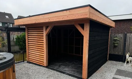 Douglas vrijstaande overkapping -400x350cm staandermaat -Wanden aan de buitenzijde bekleed met Douglas zwart Zweeds rabat 27mm, zwart genageld -Shutter van 150cm breed met Douglas planken blank -Binnenzijde…