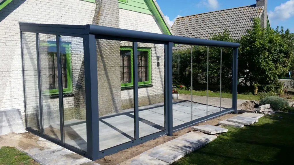 – In de voorzijde een vast gedeelte met glas voor 200cm + tussenstaander. Daarnaast een 4-delige glazen schuifwand