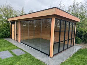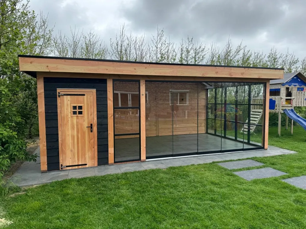 -In de rechterzijde van de veranda 4 vaste zwarte steel look panelen