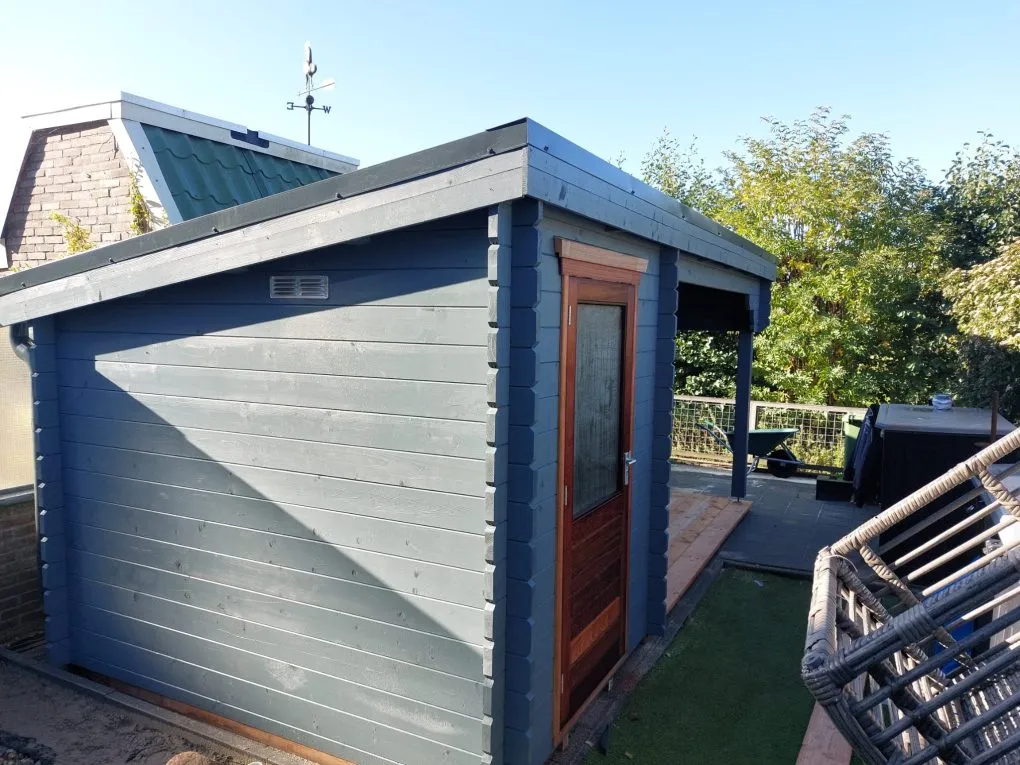 -34mm vuren blokhuthout buitenzijde 2x gecoat + binnenzijde van de veranda, wanden en accenten gecoat: Ral 7031 (blauwgrijs)
