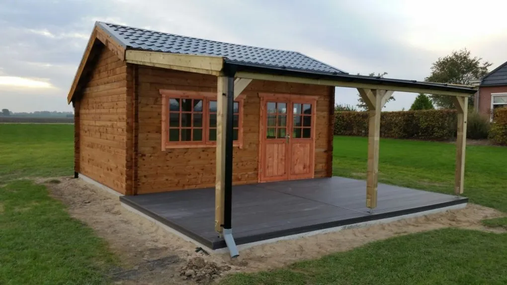 – Blokhut is uitgevoerd in 70mm bruin keteldruk geïmpregneerd blokhuthout
