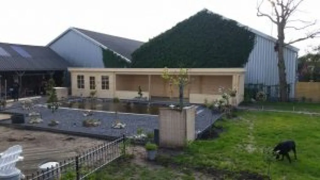 Voorzijde veranda gesloten voor 5 planken hoog met in het midden een doorloop van ca. 330cm