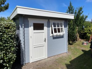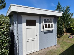 -34mm vuren blokhuthout, gecoat 2x buitenzijde wanden ral 7040, accenten 9010
