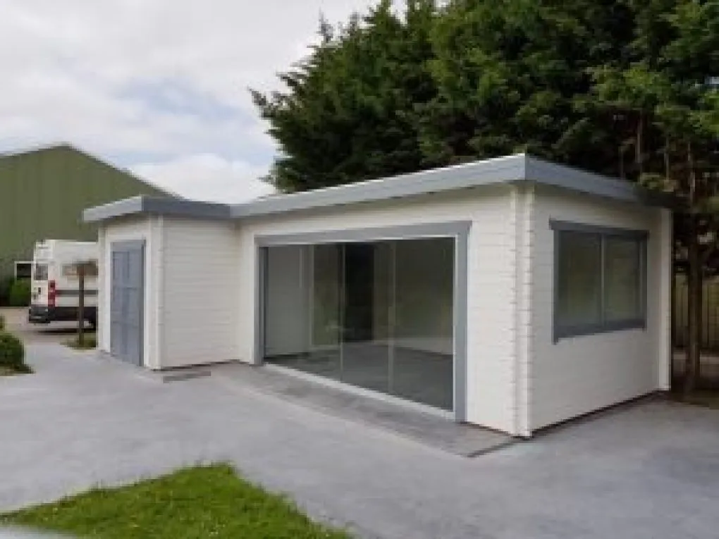 – Uitgevoerd in 60mm gecoat blokhuthout, wanden in de kleur RAL9010. De deuren, raam, waterborden, dakbalken en stelkozijn van glaspui RAL7046
