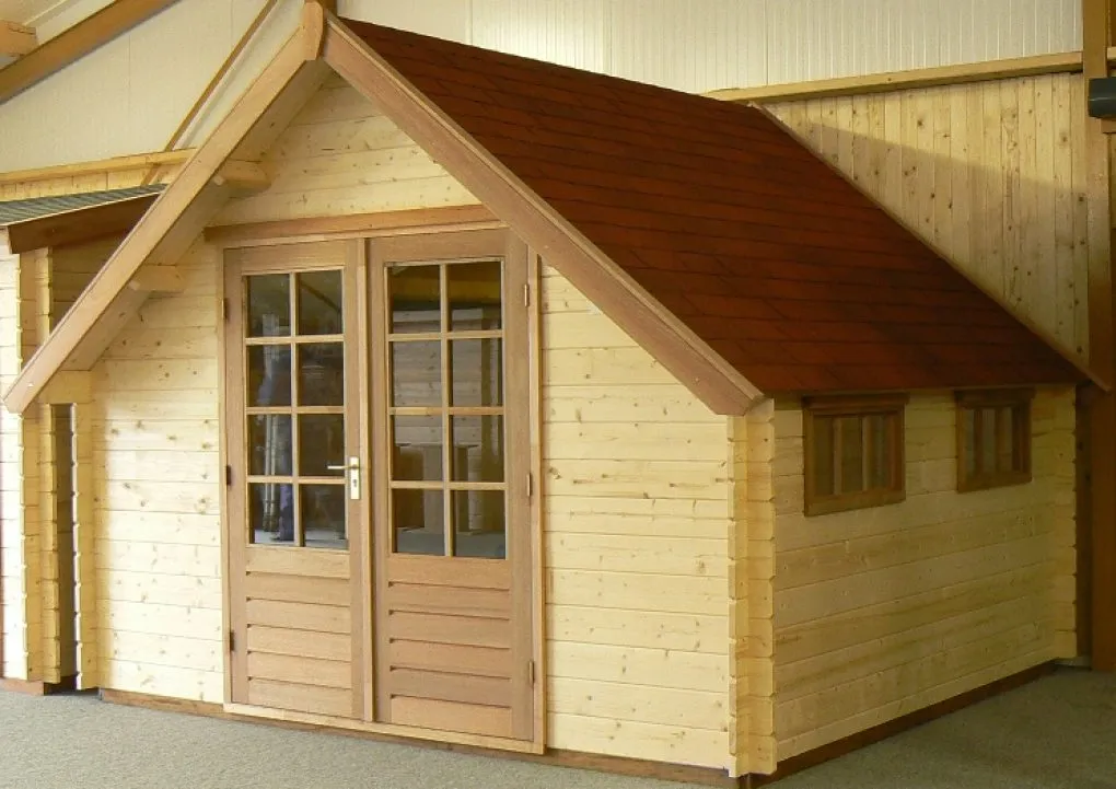 De blokhut heeft een hoge nok, 285cm. Op het dak zijn shingles aangebracht.