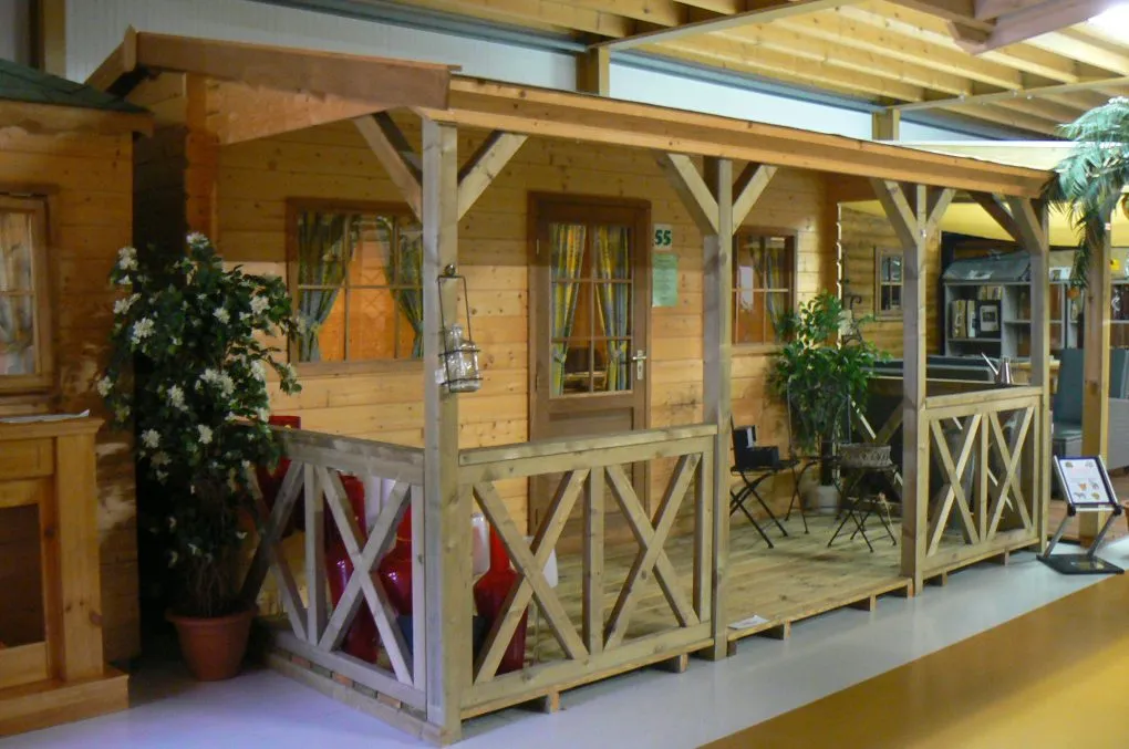 Aan de blokhut zit een veranda van ± 225cm diep. Met vier geïmpregneerde steunpalen 89x89mm met schoren, kruishekjes en een geïmpregneerd terrasvlonder 28mm dik op hardhouten liggers (deze is optioneel te bestellen, standaard wordt er een hardhouten funderingsrand geleverd).