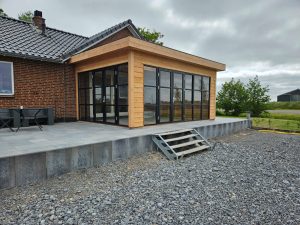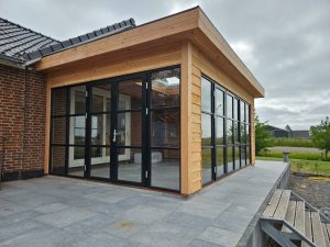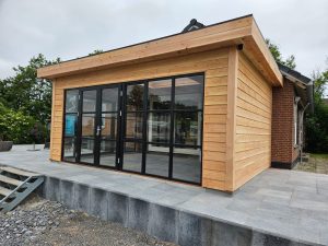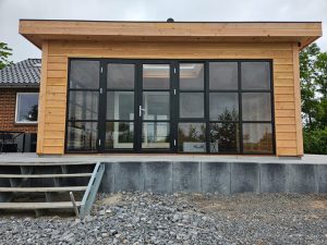 -In de voorzijde een “ Steellook “ dubbele deur + 2 vaste panelen + 1 paneel met een groot draai-kiep raam en korte wandje links en rechts met Douglas blank Zweeds rabat 27mm