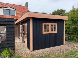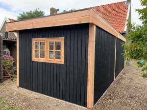 – Wanden aan de buitenzijde bekleed met zwart halfhouts rabat, verticaal