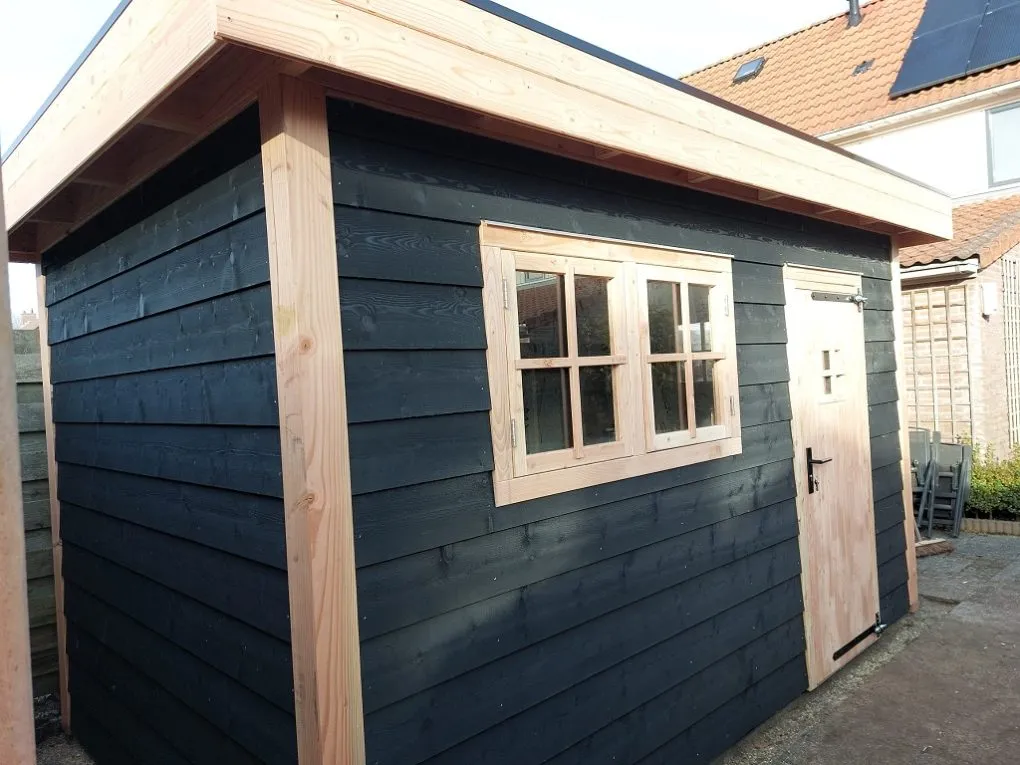 -1 Douglas enkele deur met zwart beslag en klein raampje in de voorzijde met daarnaast een dubbel Douglas uitzetraam incl. enkel glas