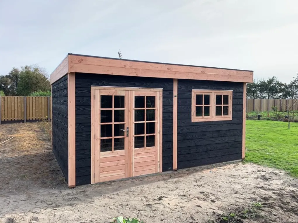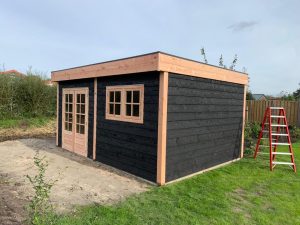 -Elementbouw, wanden enkelzijdig bekleed met Douglas Zweeds rabat, zwart gespoten 27mm, zwart genageld