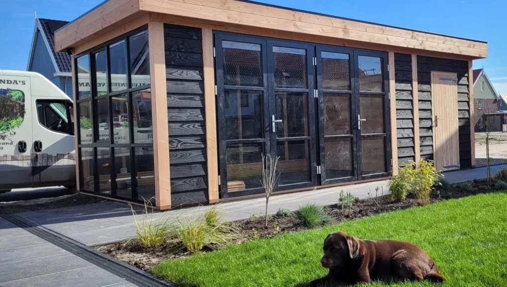 – Hardhouten funderingsrand onder de wanden, staanders en ‘’Steellook’’ panelen