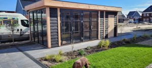 – Linkerzijde van de veranda gesloten met 4x ‘’Steellook’’ panelen zwart incl. gelaagd glas waarvan één paneel met een groot draai/kiep raam