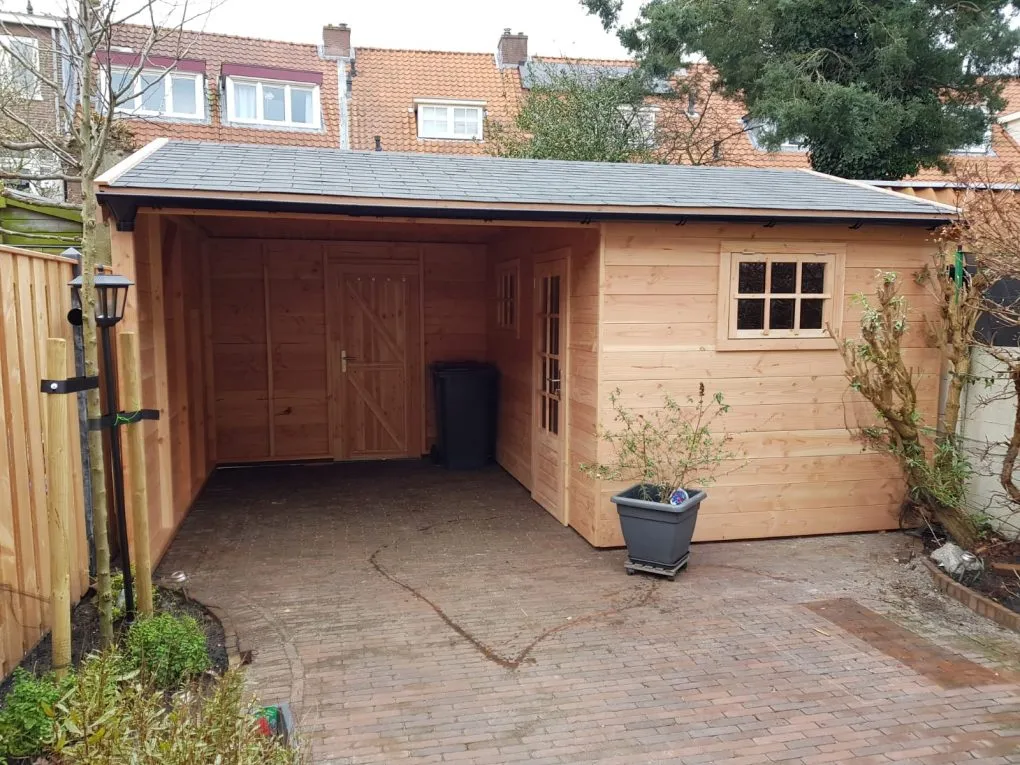 -In de linkerzijwand van de berging een Douglas enkele deur half glas met daarnaast een Douglas uitzetraam