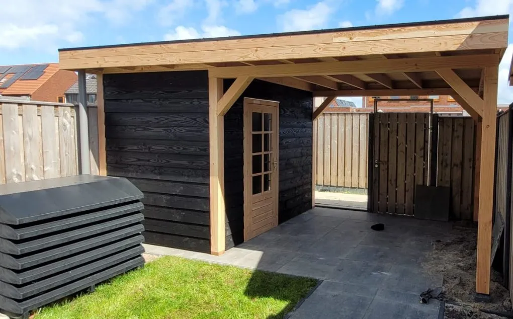 – Wanden aan de buitenzijde bekleed met Douglas zwart Zweeds rabat 27mm, zwart genageld