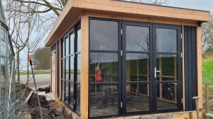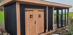-In de voorzijde van de berging een Douglas dubbele deur met zwart beslag en een klein ruitje