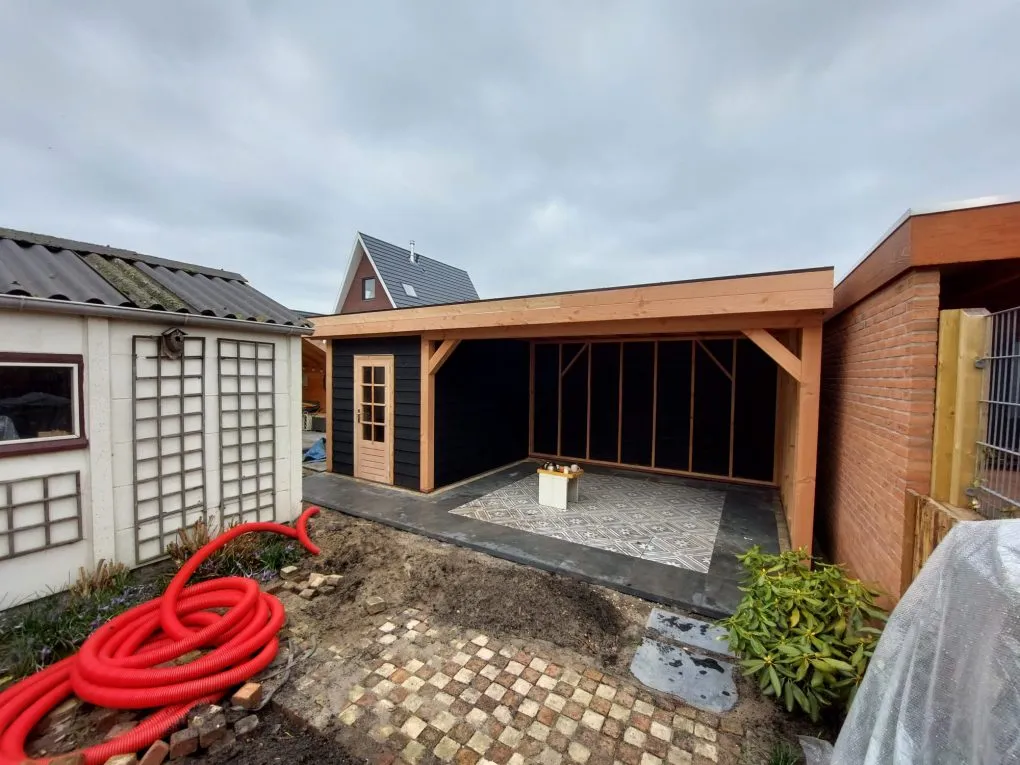 overkapping ±450cm breed (tussen staander tot buitenkant staander en stukje wand/schutting ±120cm met hiernaast een hardhouten paal 85x85mm, geschaafd met snelbeton in de grond