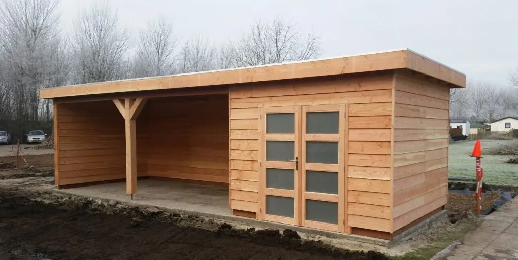 – Uitgevoerd in elementbouw, de wanden bekleed met Douglas Zweeds rabat 27x195mm op een vuren frame, RVS genageld